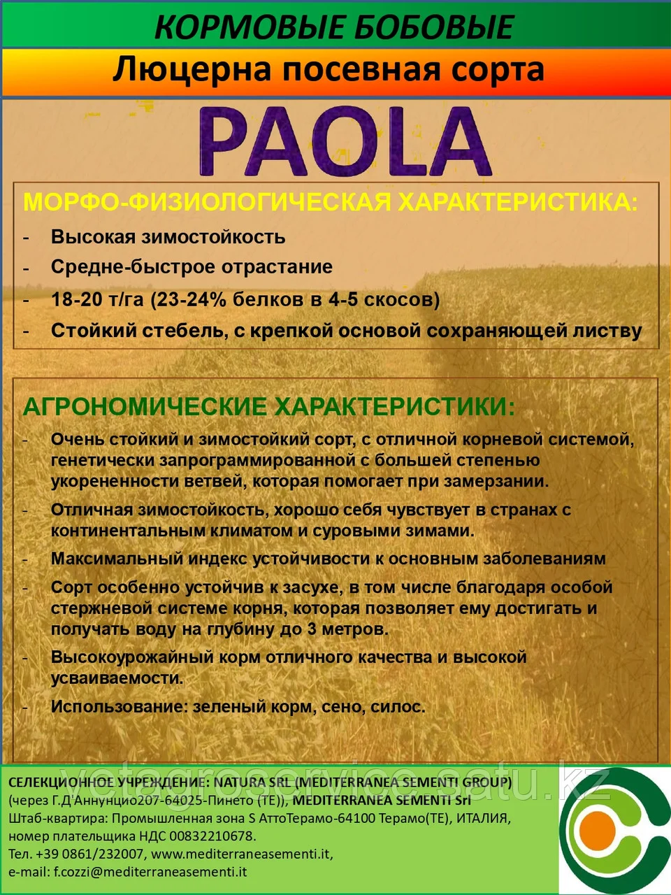 Главной особенностью сорта «Паола» является состав оболочки. При инокуляции семян используются ризобии от компании Nadi Com и итальянский продукт — Mikar ® seed liquid от SPAA srl. Это биостимулятор и инокулят микоризных грибов. Его функция заключается в повышении урожайности сельскохозяйственных культур. Он воздействует на процессы накопления полезных веществ в тканях, способствует повышению всхожести и плотности посева всех сельскохозяйственных культур, уменьшению количества вредных микроорганизмов в корневой системе, а также улучшает усвоение органических и химических удобрений, которые повышают плодородие почвы, способствуя накоплению фосфора и микроэлементов в почве.